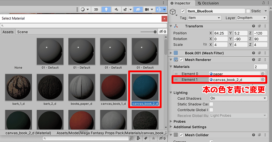 ​ 黄色い本に対応していることがわかりやすいように、マテリアルは本と同じもの「gold」に変更しておきます。
