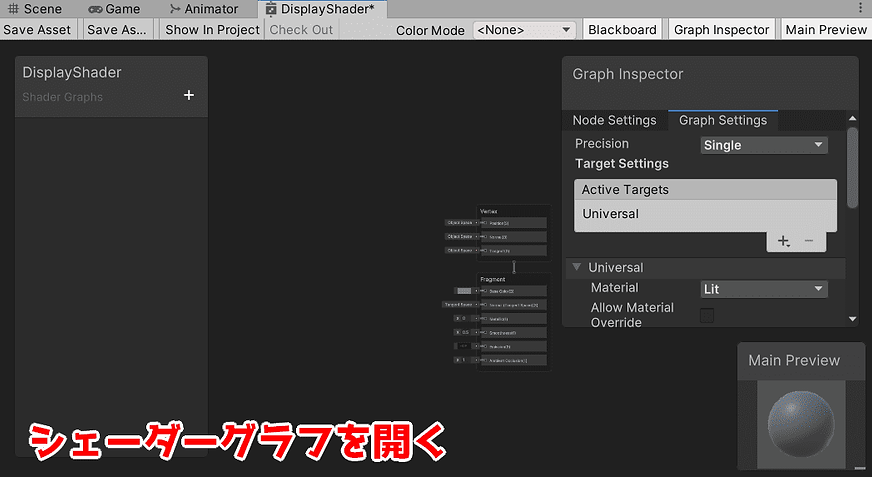 シェーダーグラフ編集画面を開いて、Graph Settings のMaterialを「Lit」から「Unlit」へ変更してください。これでライティングが適用されない設定になります。