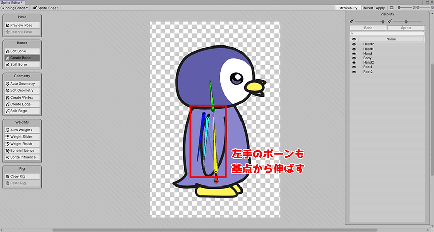 まずはスプライトにボーン(骨)を入れていきましょう。基本的な考え方は3Dモデルと同じです。
