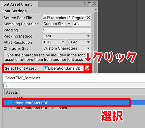 Select Font Assetに「LiberationSans SDF」を設定してください。これでUnityで使えるように変換する文字を指定できます。