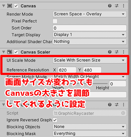 ウィンドウサイズが変わっても大きさを調整できるように、Canvasの設定を変更してください。