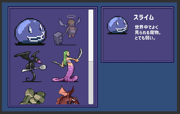 ここでは簡易的なモンスター図鑑の実装方法を解説していきます。モンスター図鑑を実装する予定のないゲームでも、キャラクター図鑑やアイテム欄、ステージセレクトなどにも応用できる機能なのでぜひ使ってみてください。手順自体は多いですが、プログラム量は少なめです。